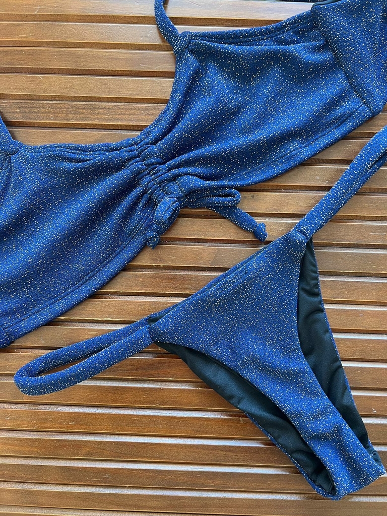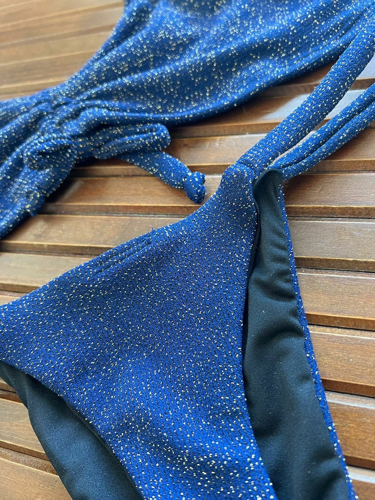 Eleve o seu estilo na areia com o biquíni azul marinho lurex, uma escolha que transcende a moda praia convencional. Este biquíni não é apenas uma peça de roupa de banho; é uma expressão de sofisticação e glamour à beira-mar.