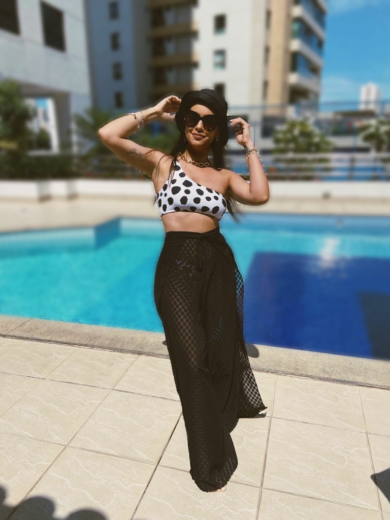 Calça envelope com tecido poá com transparência. Fica super arrumado.